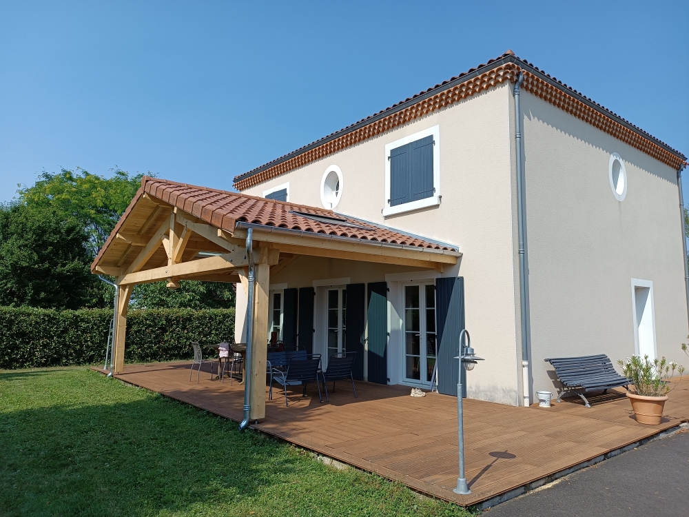 Votre charpentier à Beauregard l'Evêque, a réalisé la conception et la fabrication ainsi que la pose de cette charpente traditionnelle pour un auvent de terrasse. La couverture et la zinguerie ont été réalisé par l'entreprise, deux fenêtres de toits de la marque Velux ont été installées. Les moyens de levage sont assurés par les grues Klaas.