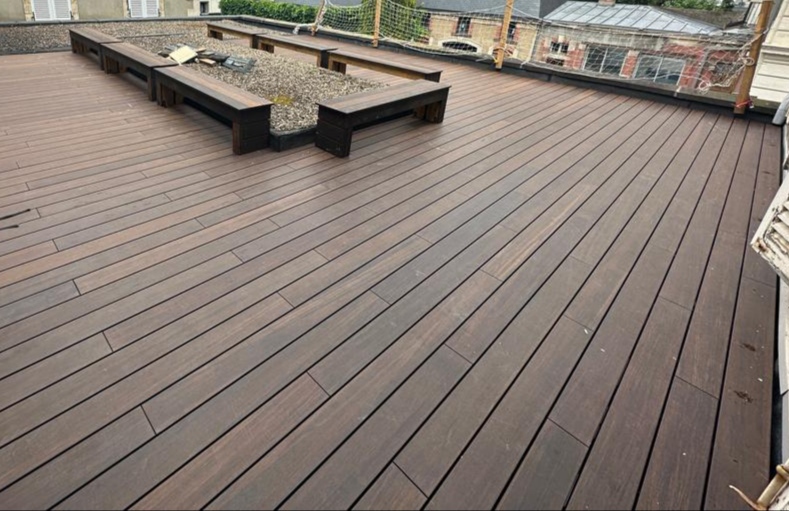 Votre charpentier à Clermont-Ferrand, a réalisé une terrasse en bois de type bambou, avec une pose sur plots en plastique réglables et lambourdes bois. Fabrication en atelier et pose de bancs également en bambou.